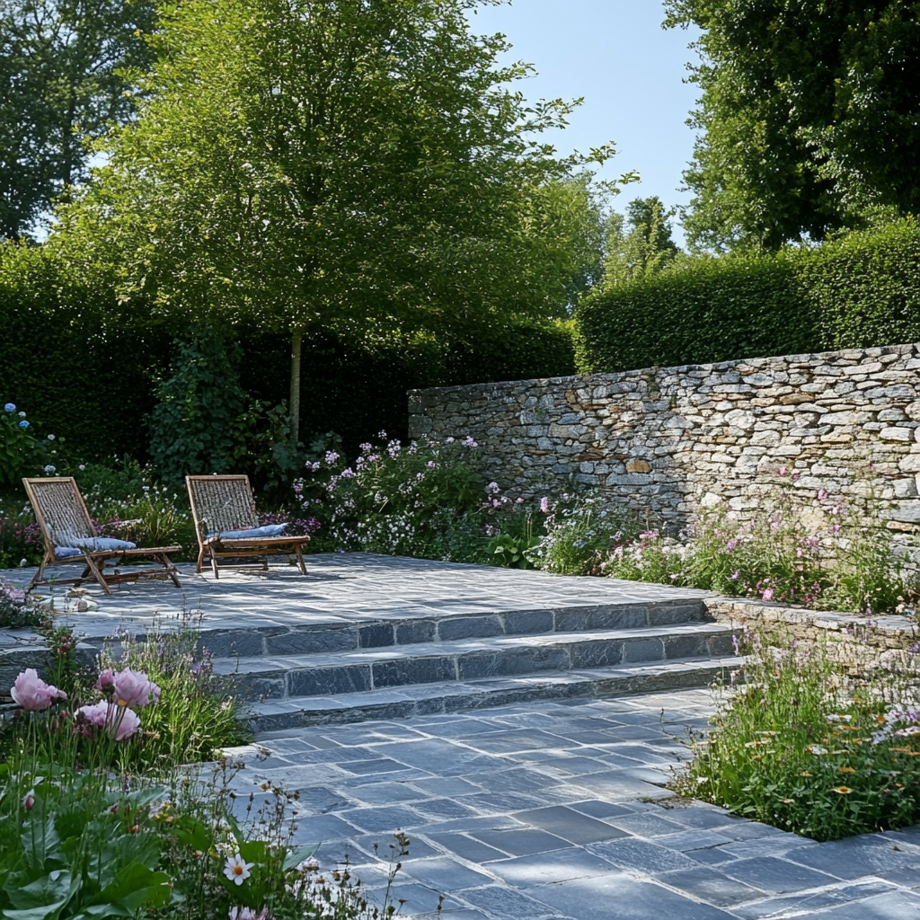 | Ardoise | Dalles régulières ou irrégulières | ●●● | Élégante, idéale pour des terrasses au tracé contemporain. Apporte une ambiance sobre et raffinée. |